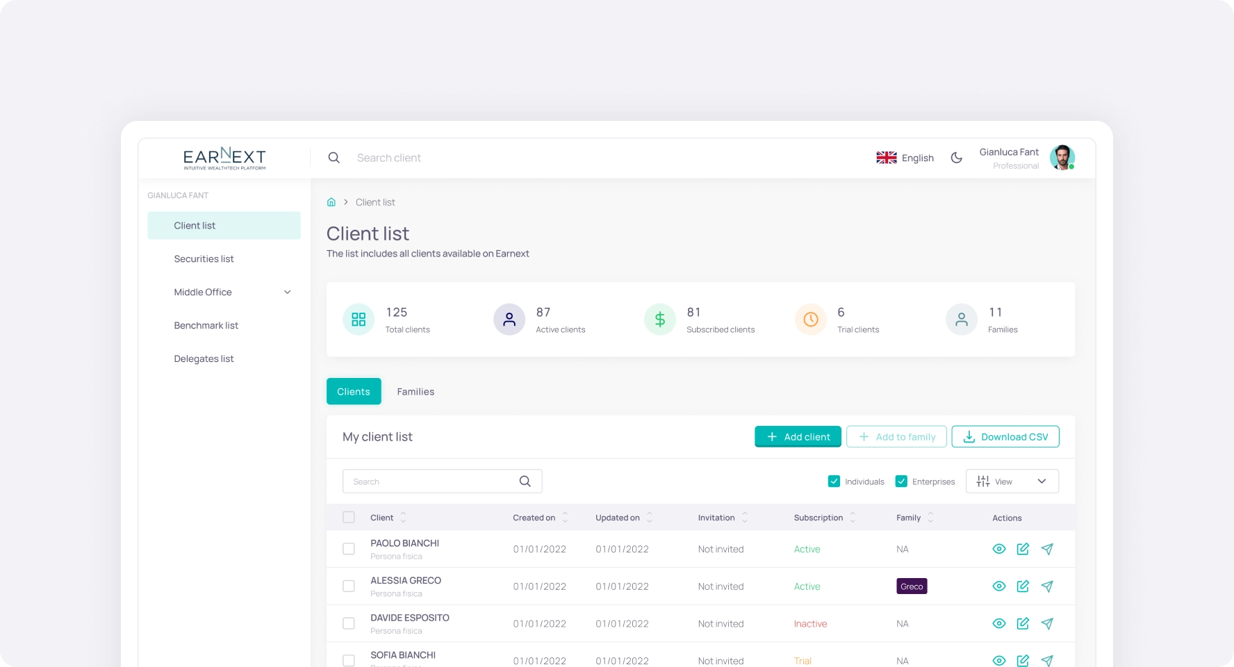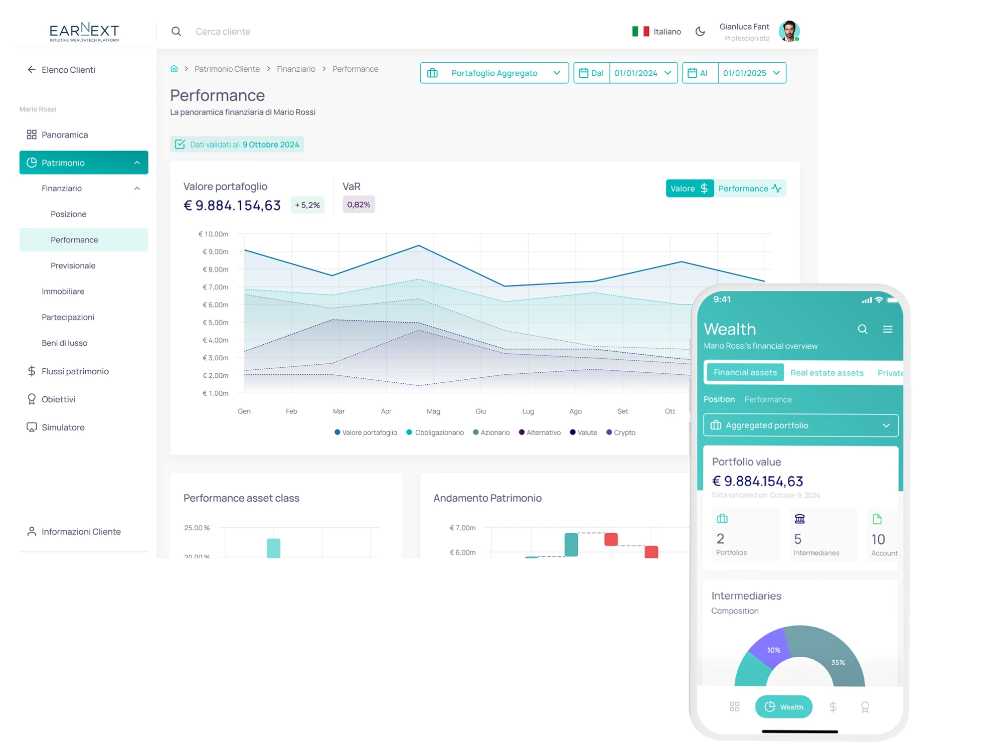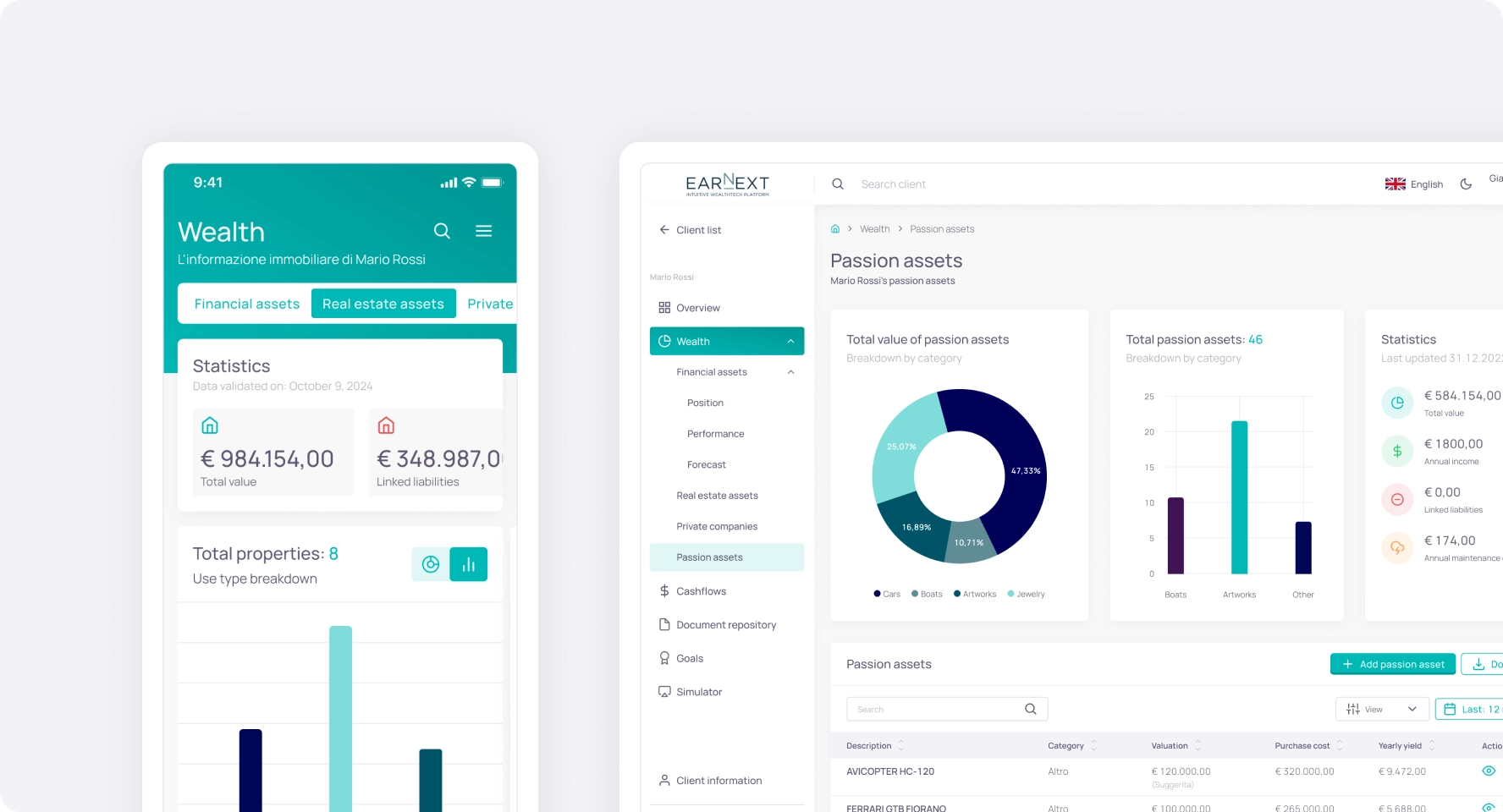 Earnext lets you create a shared, secure, and selective digital environment, giving your clients a clear and professional view of their wealth.