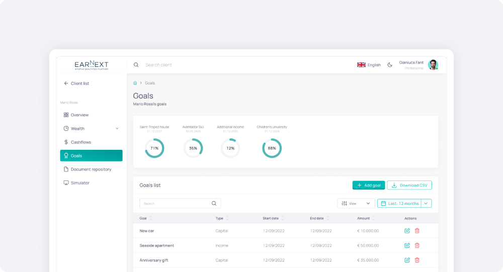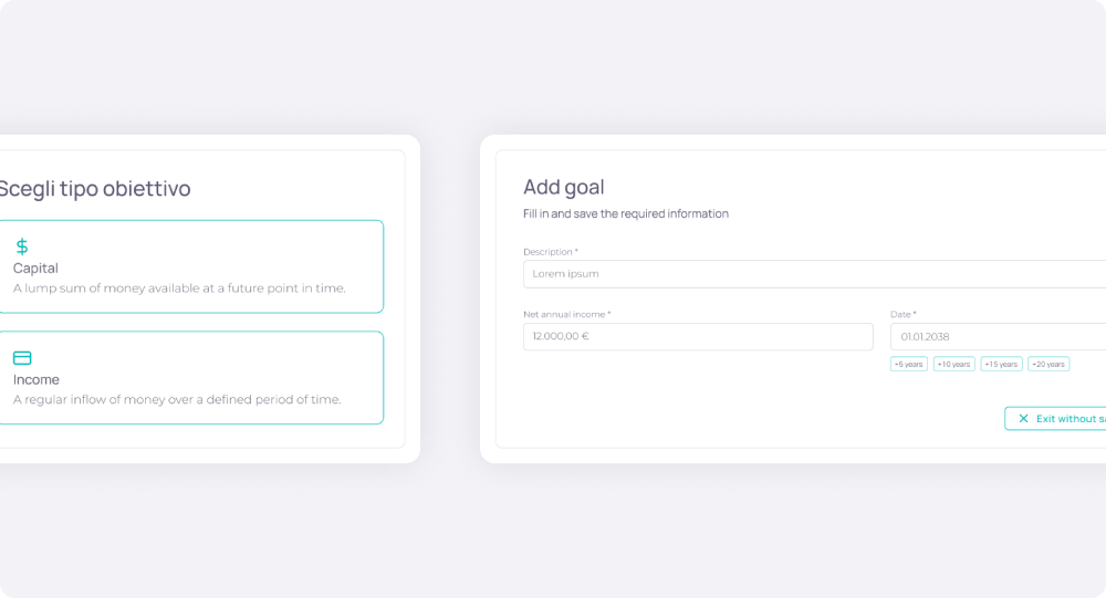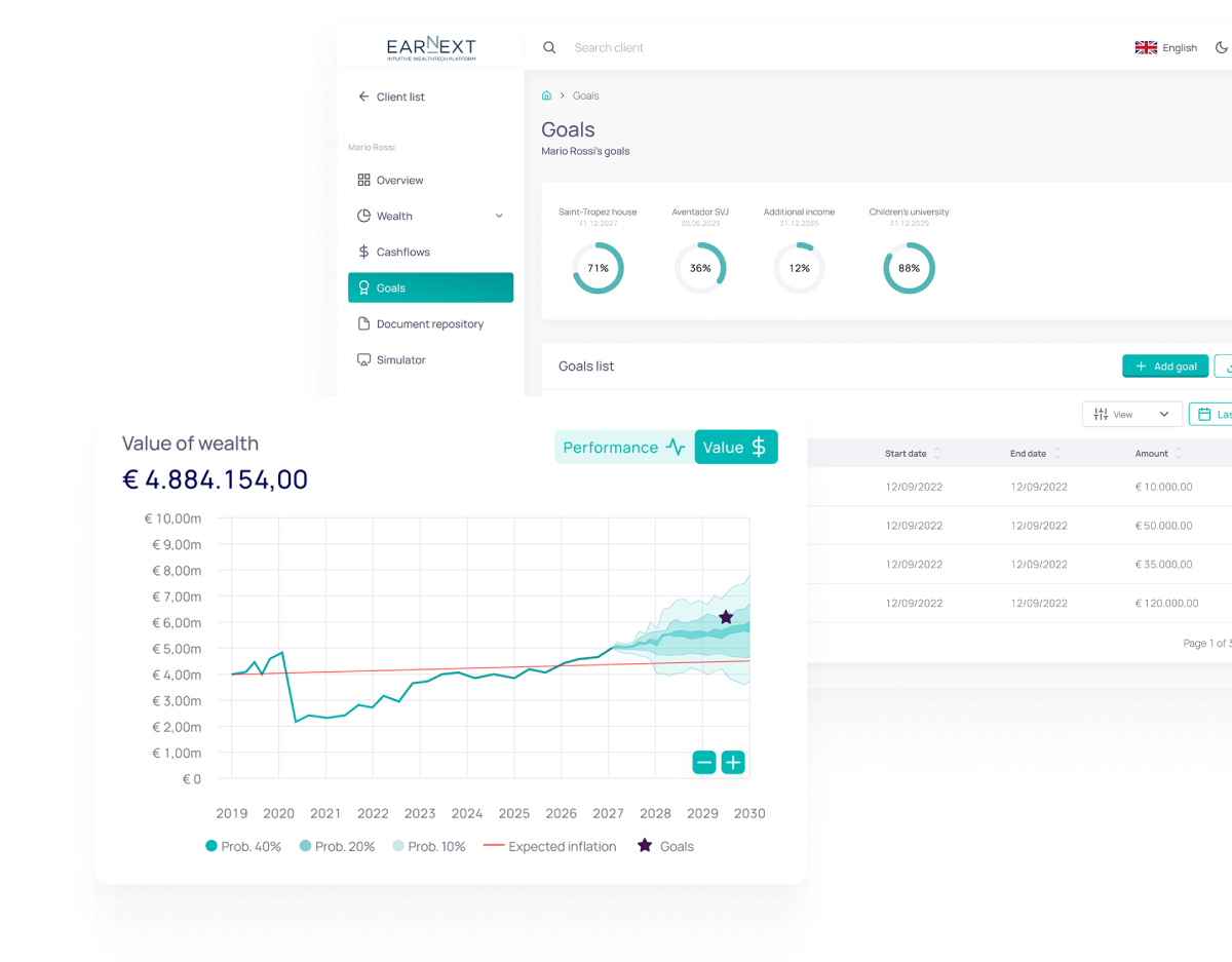Earnext ti aiuta a trasformare i dati patrimoniali in piani personalizzati e scenari dinamici. Simula obiettivi futuri di capitale, rendita o scadenza e guida il cliente verso scelte più consapevoli.