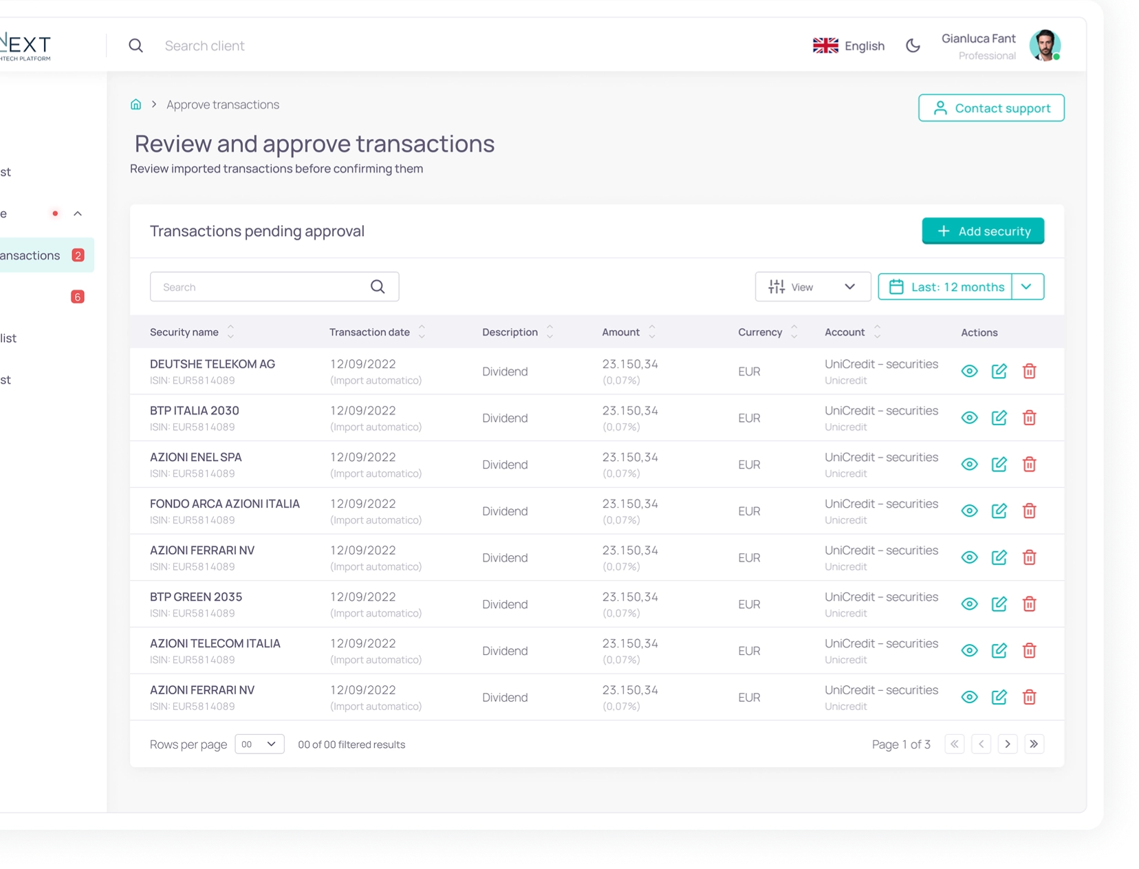 Earnext è pensato per chi gestisce patrimoni complessi per conto terzi. Fiduciari, advisor e società di consulenza possono offrire ai propri clienti un servizio più efficiente, sicuro e tracciabile, semplificando la governance e riducendo i rischi operativi. Cosa puoi fare con Earnext: