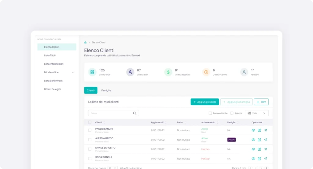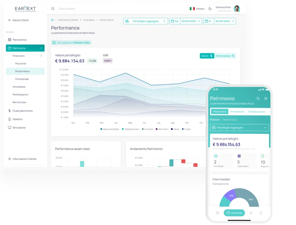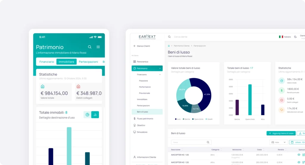 Earnext ti permette di creare un ambiente digitale condiviso, sicuro e selettivo, per offrire ai tuoi clienti una vista ordinata e professionale del loro patrimonio.