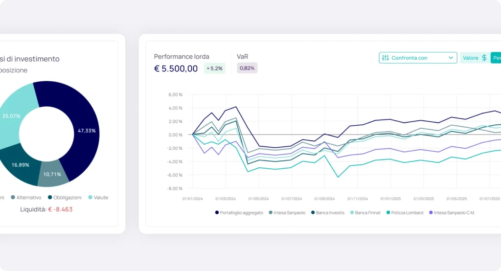 Configura cosa mostrare al cliente: dati aggregati, trend, grafici, categorie patrimoniali. Tutto pronto da visualizzare o esportare.