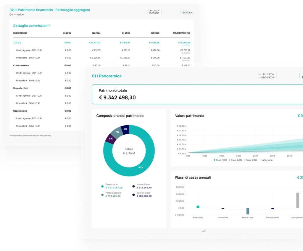 Con Earnext puoi generare report patrimoniali chiari, professionali e personalizzati. Analizza dati, monitora evoluzioni e supporta le tue decisioni strategiche con indicatori affidabili e aggiornati.