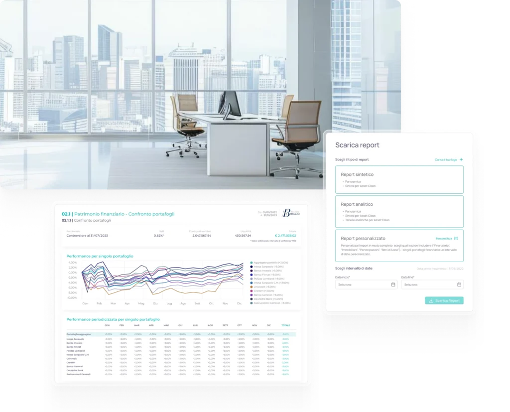 Report chiari, personalizzabili, sempre aggiornati. Perfetti per review trimestrali, onboarding e incontri ereditari.
